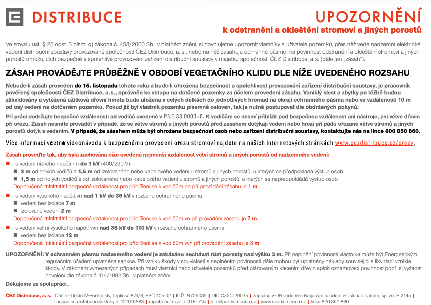 | UPOZORNĚNÍ k odstranění a okleštění stromoví a jiných porostů Úřední deska | ||